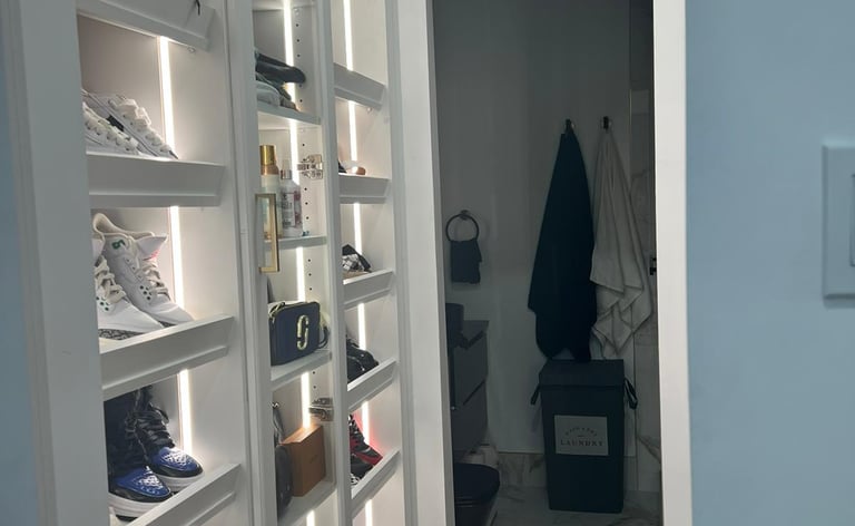 Walk-In Closets: Elevate your living spaces with our custom-designed bathrooms and closets, meticulously crafted to suit your style and preferences. Experience luxury and functionality with our tailored solutions that bring sophistication and organization to your home."